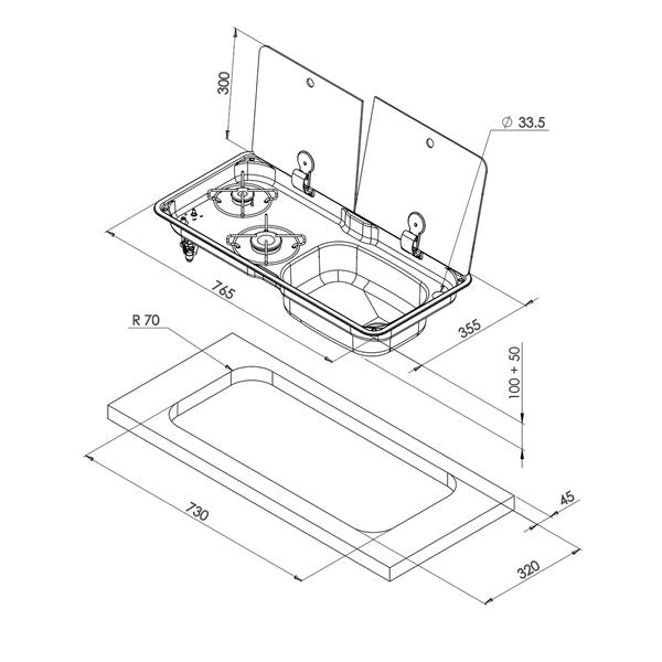This FL1765 model unit measures 765 x 355 with a built-in size of 730 x 320mm. The hob area has a 48mm depth and the sink has a depth of 150mm.