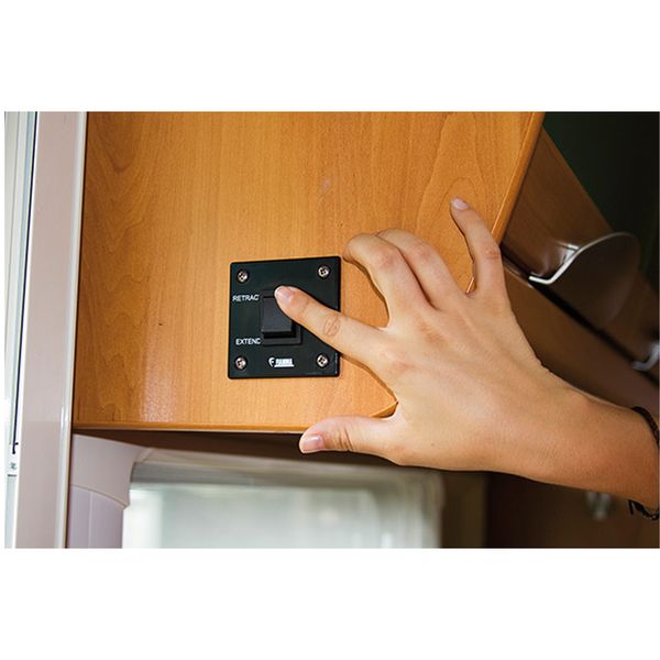 The awning can be easily opened and closed using the supplied rocker switch, designed for wall installation in the vehicle. The motor kit also allows manual closing in case of an emergency.