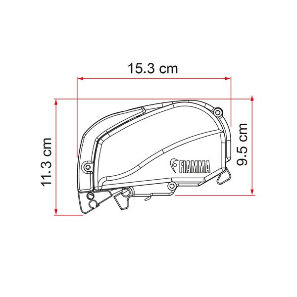 The awning features a grey fabric in a black aluminium casing, with a visible winch loop for ease of use. A roller support system facilitates the rolling up of the fabric and reinforced arms keep the fabric tensioned when open.